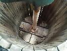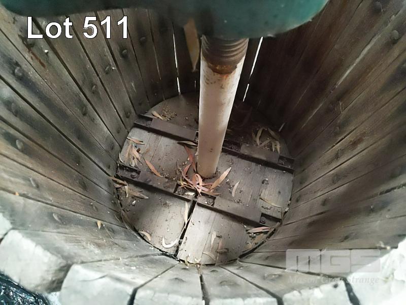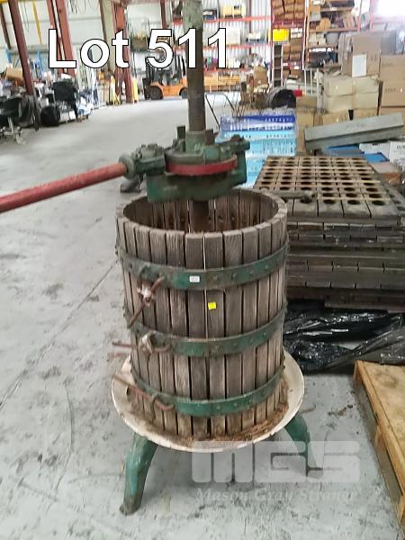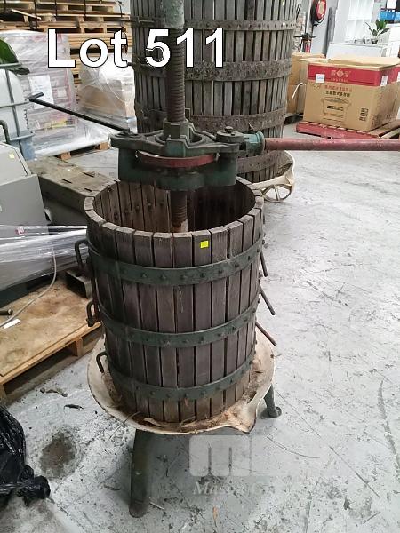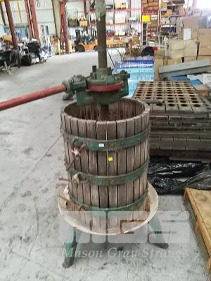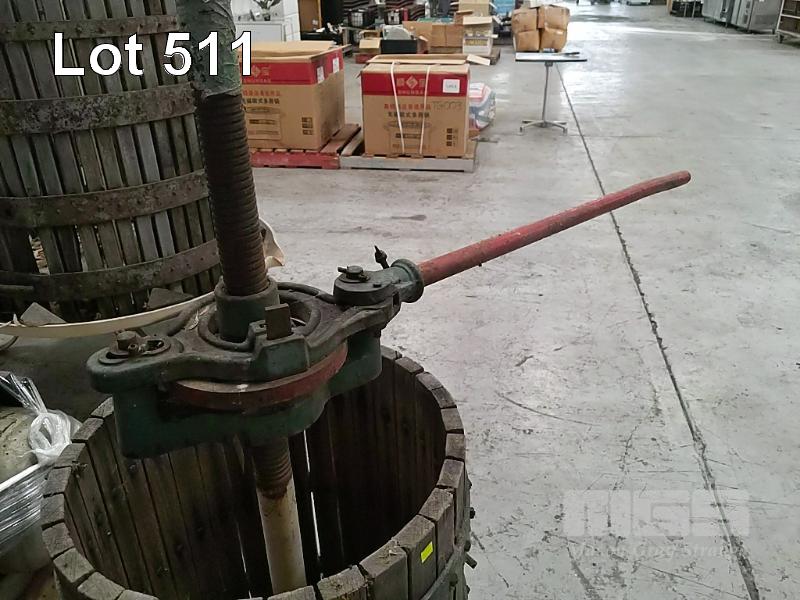 MANUAL WINE GRAPE BASKET PRESS. CAGE DIAMETER 53CM. HEIGHT 70CM. BASE, THREADED SHAFT, RATCHET AND LEVER. 2 X CAGE SECTIONS. 2 X SEMI-CIRCLE HEADERS. 5 X LOCKING PINS.