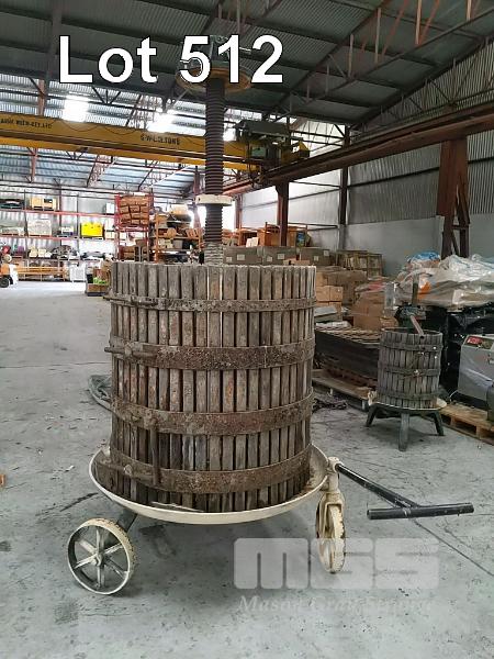 LARGE WINE GRAPE BASKET PRESS CAGE. CAGE DIAMETER 108CM. HEIGHT 115CM 2 X CAGE SECTIONS WITH 7 X LOCKING PINS. MOBILE DRAINING BASE WITH HANDLE. INTRINSIC THREADED SHAFT. ** REST OF PRESS NOT PRESENT **