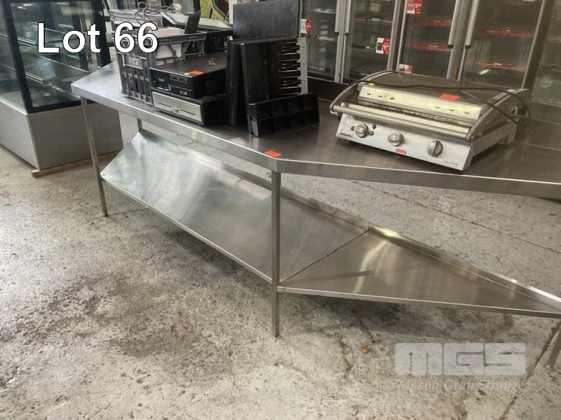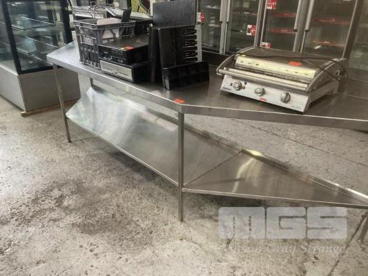 STAINLESS STEEL PREP BENCH, IRREGULAR SHAPE, 350 x 80cm, 2 TIER WITH SPLASHBACK