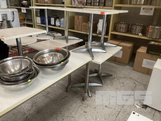 4 x CAFE TABLES, 70 x 50cm & MATCHING MOBILE TABLE, 330 x 45cm