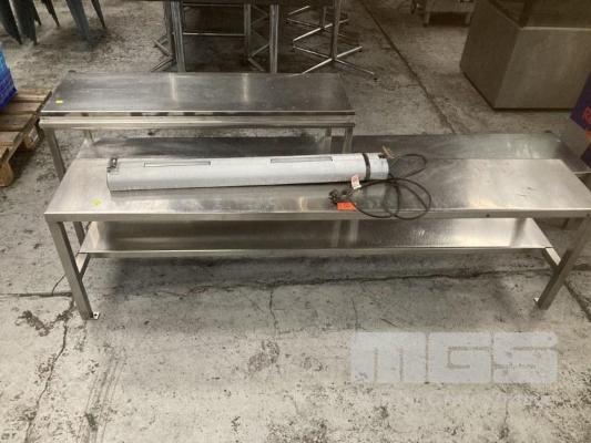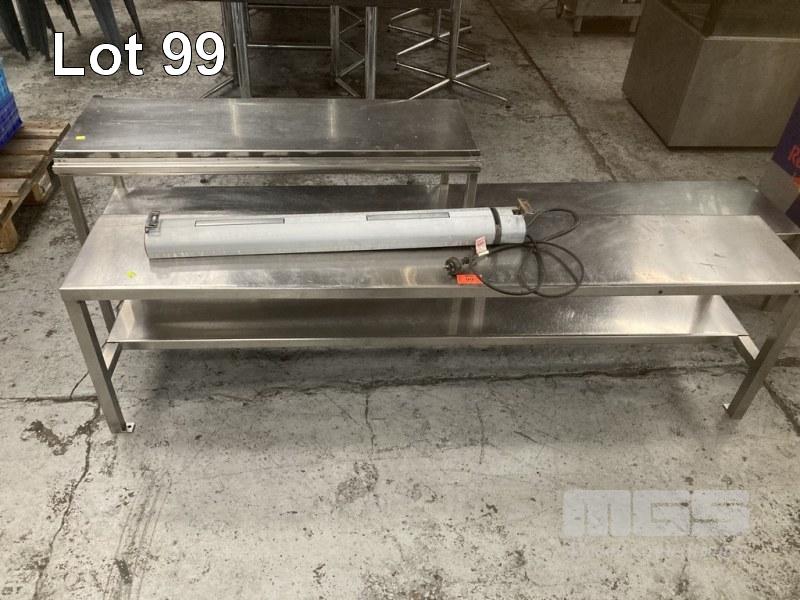 2 x STAINLESS STEEL OVERSHELVES, 220 & 175cm WITH ROBAND HEAT LAMP