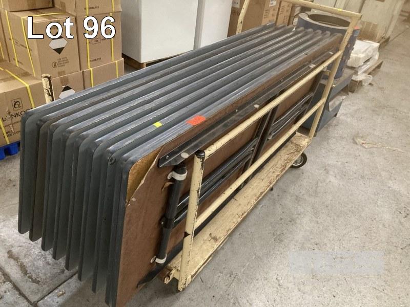 9 x TRESTLE TABLES, EACH 180 x 75cm, LAMINATE TOP & TROLLEY
