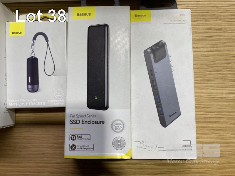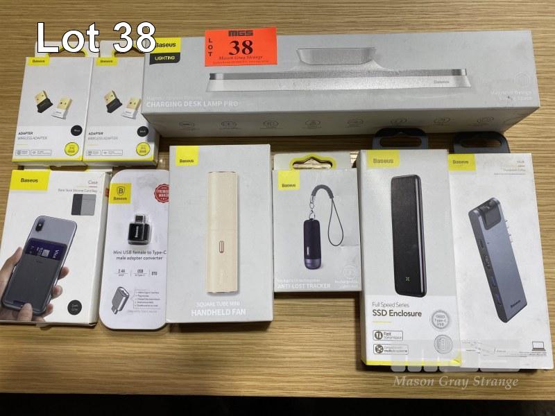 BASEUS CHARGING DESK LAMP PRO, WIRELESS ADAPTERS, BACK STICK SILICONE BARD BAG, USB TO TYPE-C ADAPTER, HANDHELD FAN, ANTI-LOST TRACKER, SSD ENCLOSURE & THUNDERBOLT C PRO HUB