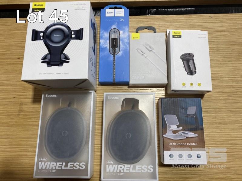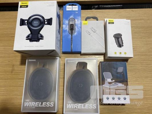 BASEUS CAR MOUNT HOLDER, CAR CHARGER, USB TO USB-C CABLES (1m & 2m), DESK PHONE HOLDER & 2 x BASEUS JELLY 15W WIRELESS CHARGERS (BS-W510)