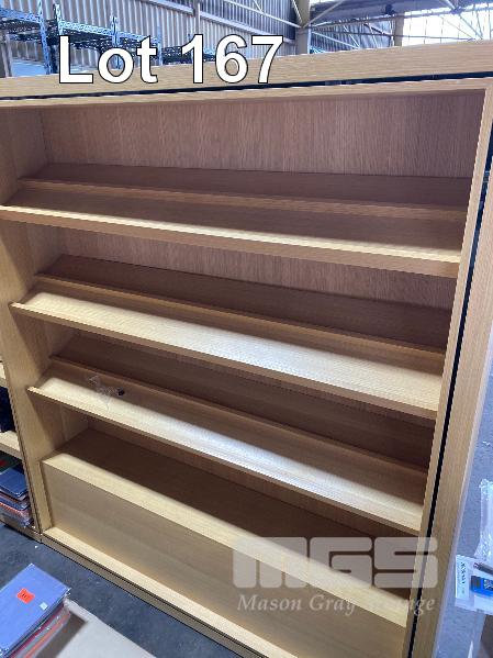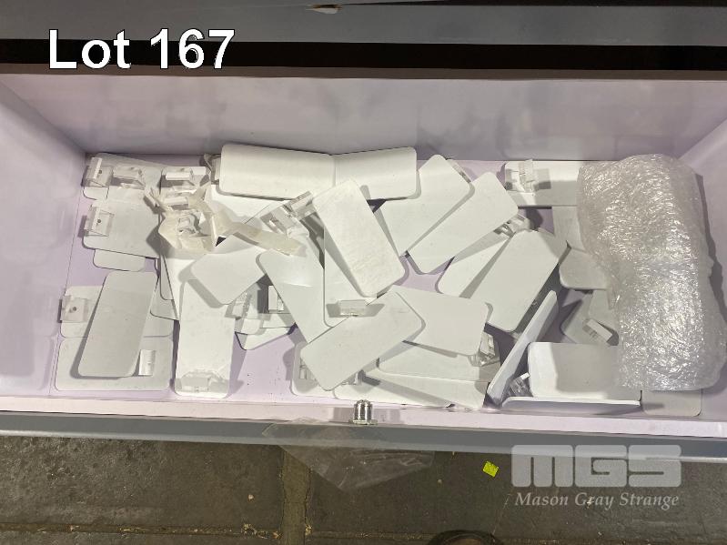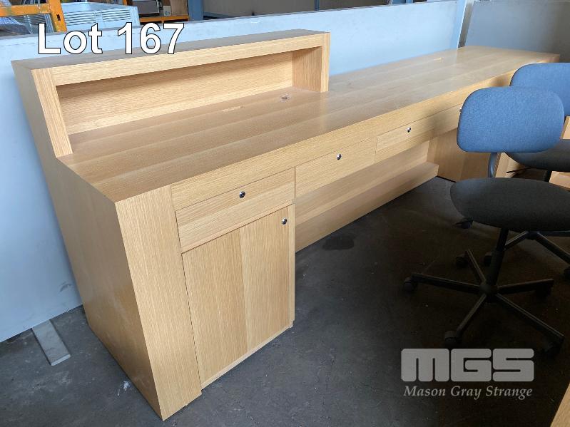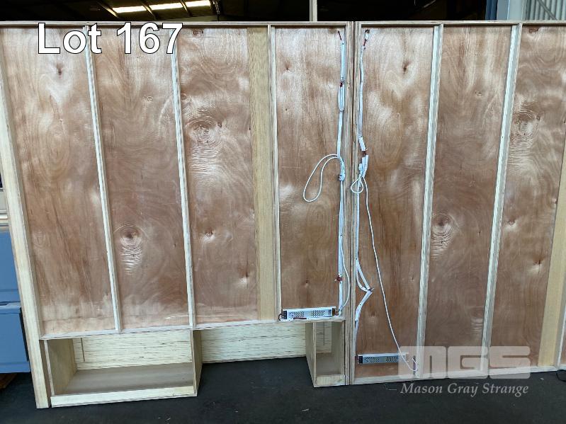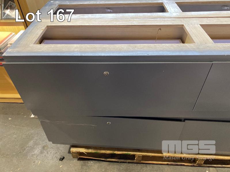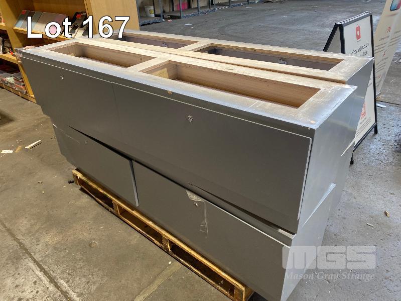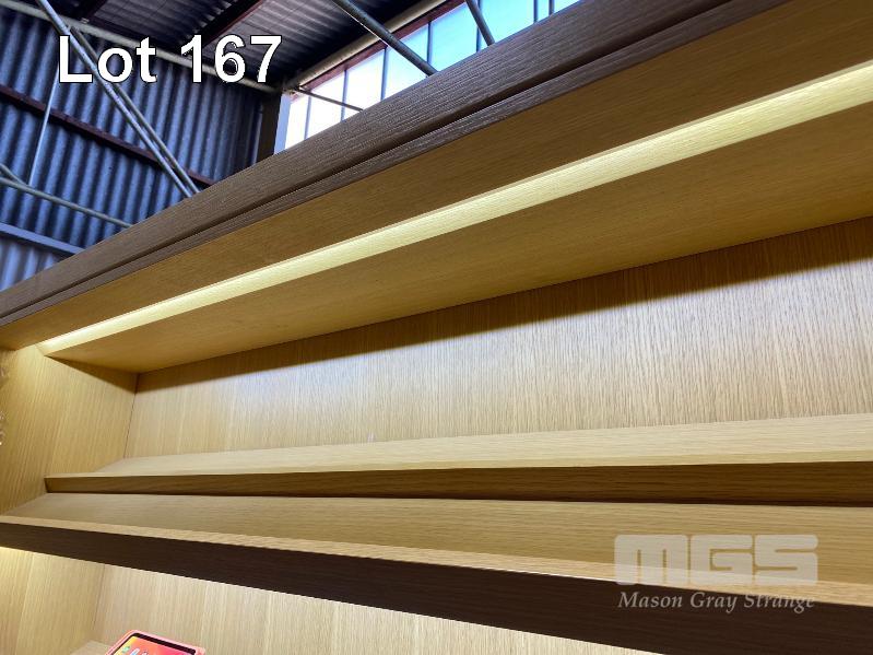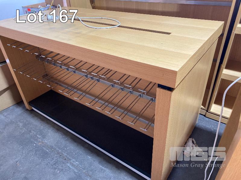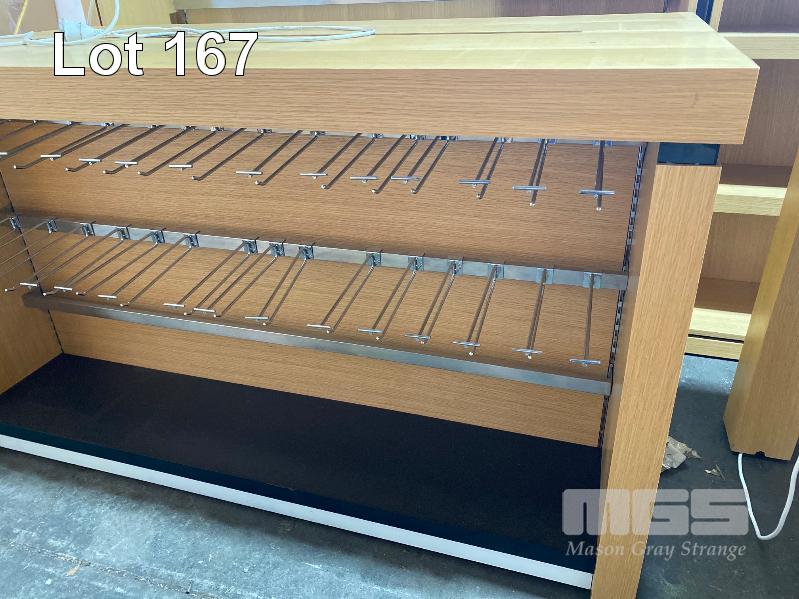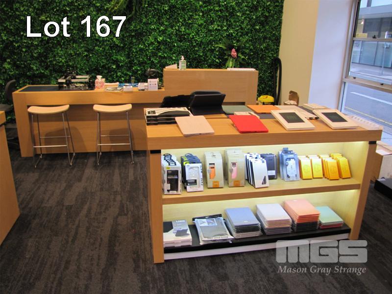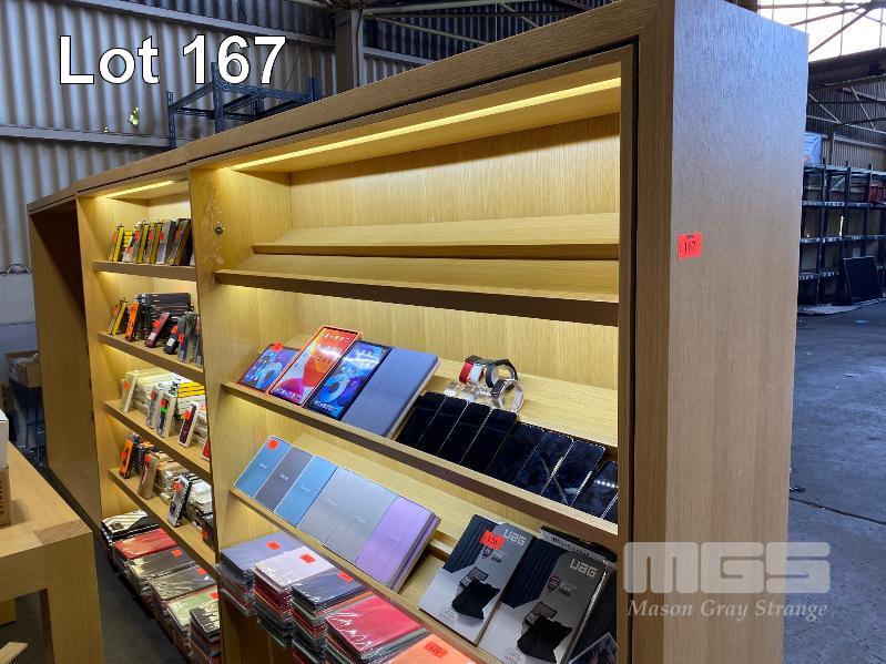 SHOP FITOUT COMPRISING 1 x SHELF UNIT, 1 x MAGAZINE SHELF UNIT, 1 x BAR HOOK DISPLAY UNIT & 1 x PHONE COVER DISPLAY UNIT, EACH 200 x 168cm WITH LED LIGHTING (SOME CABLES CUT) & BOTTOM MOUNT STORAGE DRAWER UNITS, 2 x TABLES (160 x 80cm), 2 x TABLES WITH UNDERBENCH BAR HOOKS & SHELVES (160 x 80cm), 1 x RECEPTION DESK (300 x 60cm), 2 x OFFICE CHAIRS & 4 x STOOLS (COLLECTION BY APPOINTMENT - FROM 25/5/2022)