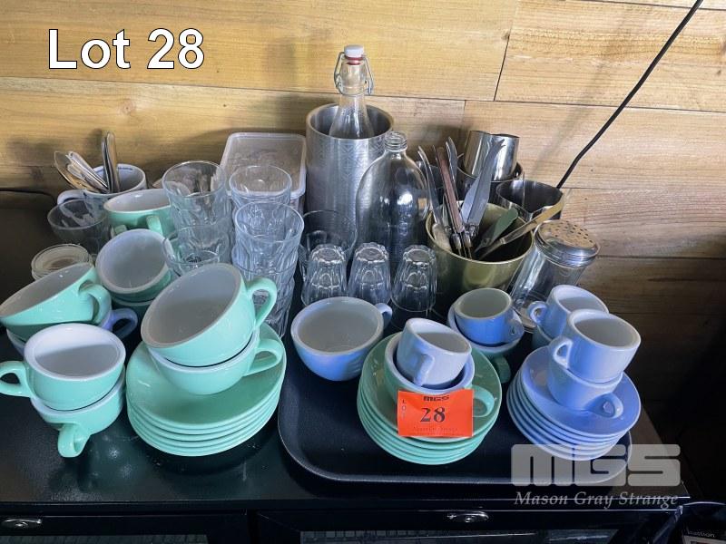 ASSORTED COFFEE CUPS, GLASSES, STAINLESS STEEL JUGS, ETC