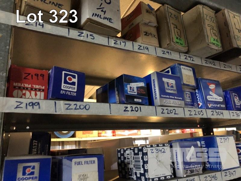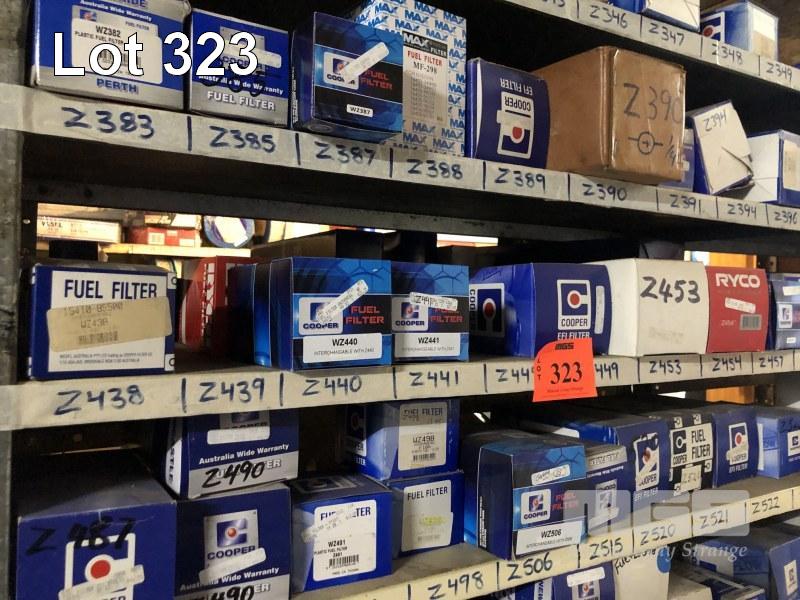 CONTENTS OF 10 SHELVES, FUEL FILTERS, COOPER, RYCO, MAX, FLEETGUARD, BALDWIN