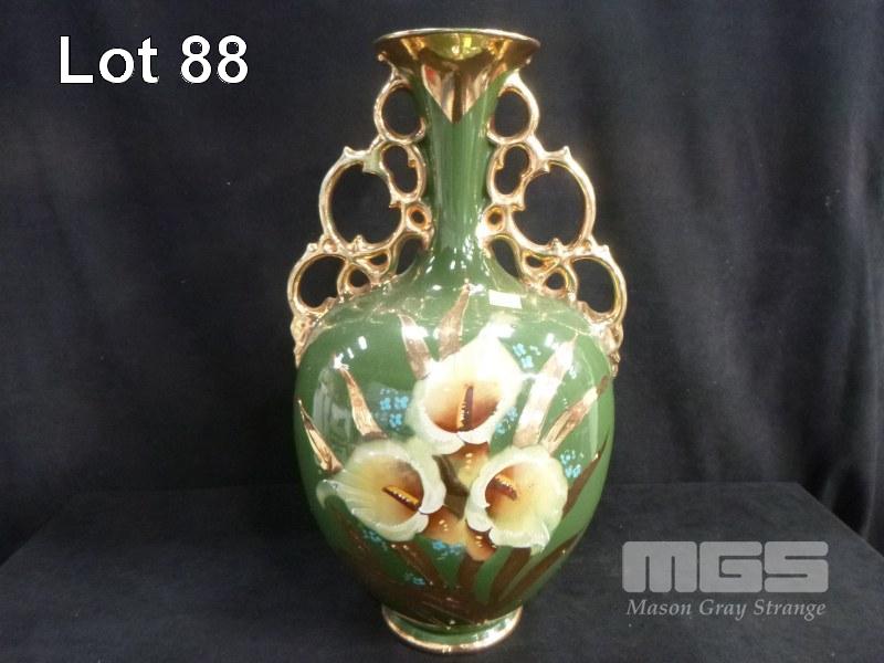 LARGE GREEN GOLD PAINTED, HANDLED VASE, HAND PAINTED DEPICTING LILES