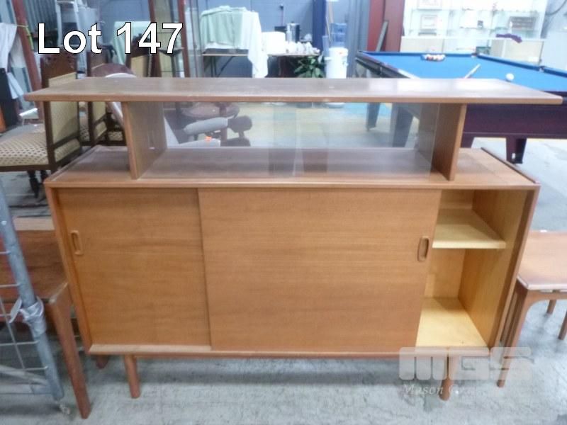 TEAK BAR UNIT, 2 x GLAZED SLIDING DOORS, 2 x TEAK SLIDING DOORS, FOOT RAIL, TIMBER LAMINATE TOP