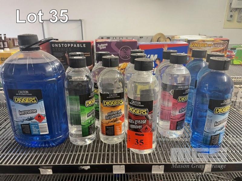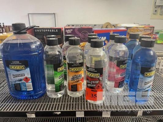 13 x BOTTLES, INC TURPS, METHYLATED SPIRITS, KERO, ETC
