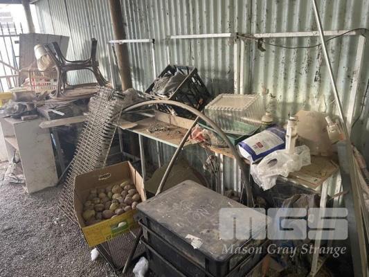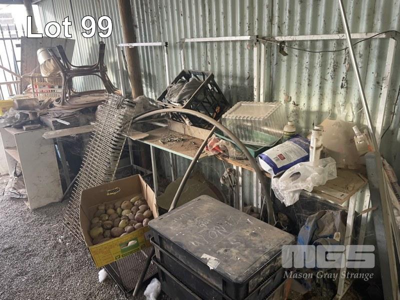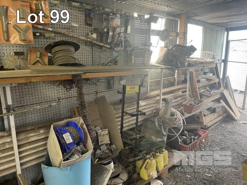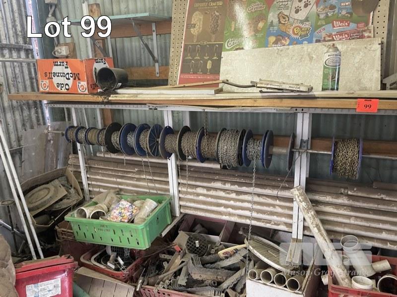 ROLLS OF CHAIN, POLY PIPE, PLUMBING FITTINGS, IRRIGATION FITTINGS, WORK BENCH, ETC, CONTENTS OF SHED ANNEXE