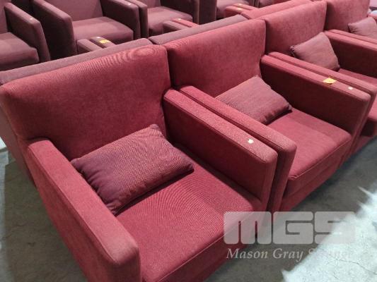 2 X UPHOLSTERED ARMCHAIRS WITH THROW CUSHIONS - TEXTURED COARSE LINEN STYLE FABRIC, TRACK ARMS IN FIRE BRICK RED.