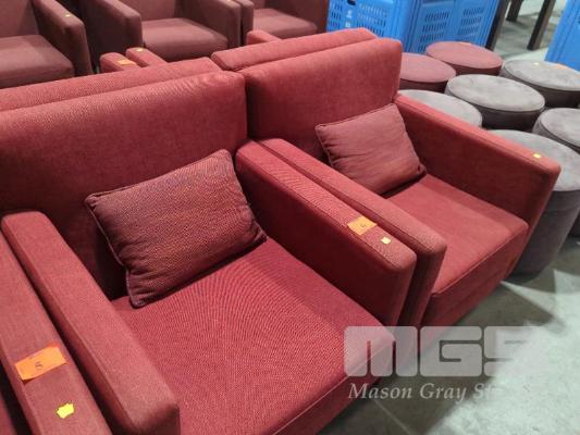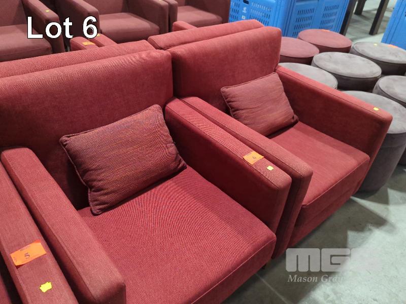 2 X UPHOLSTERED ARMCHAIRS WITH THROW CUSHIONS - TEXTURED COARSE LINEN STYLE FABRIC, TRACK ARMS IN FIRE BRICK RED.