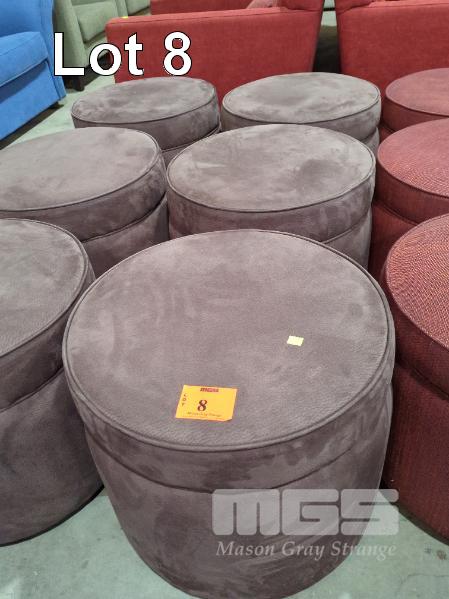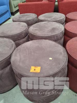 3 X UPHOLSTERED ROUND OTTOMANS. FAUX SUEDE IN GREY.