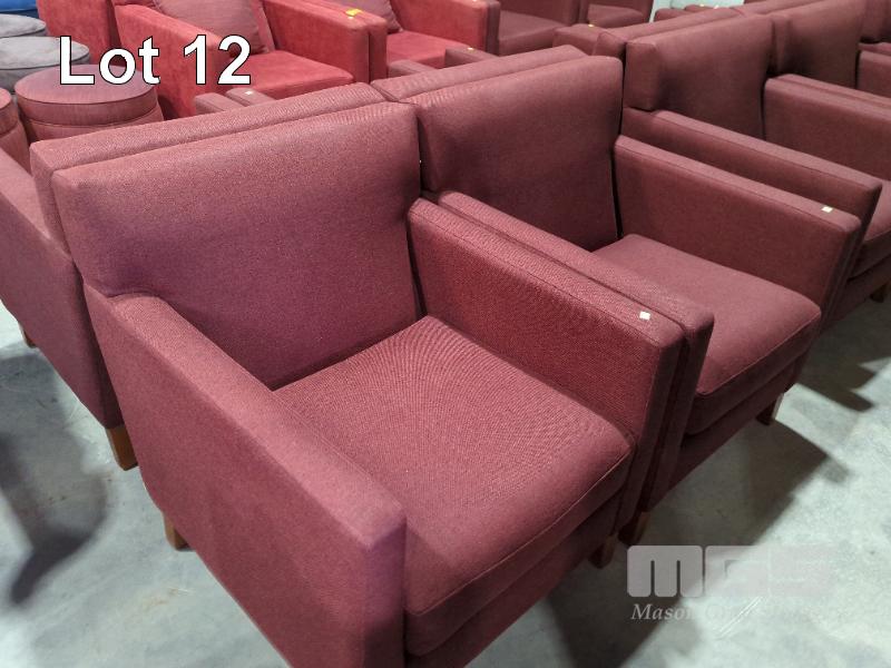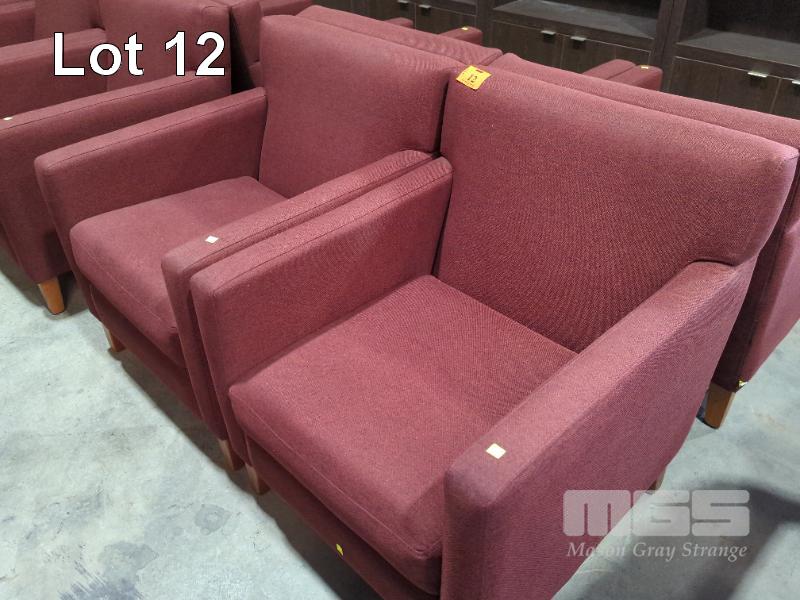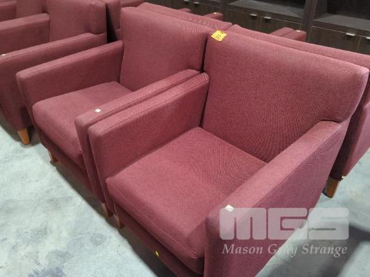 4 X UPHOLSTERED ARMCHAIRS - TEXTURED COARSE FABRIC, MIXED BRICK RED WEAVE, STITCHED TRACK ARMS.