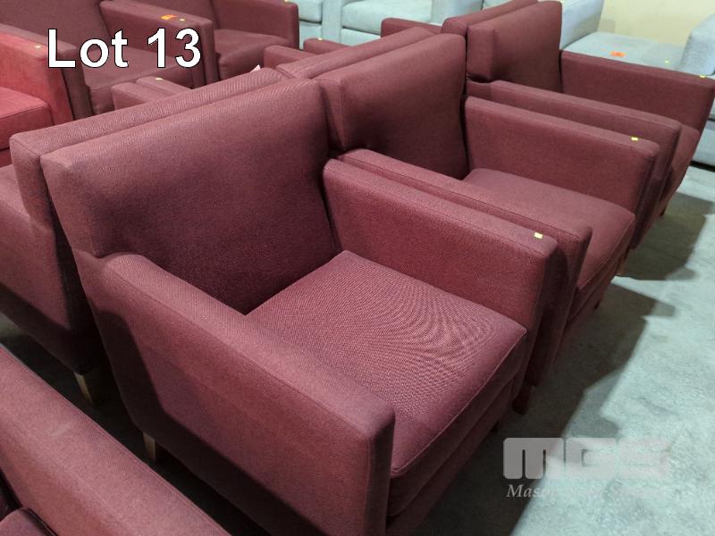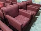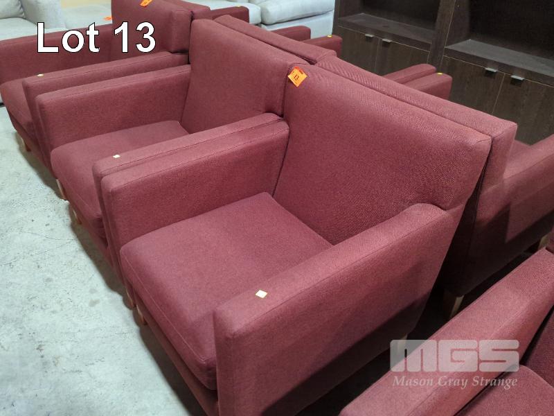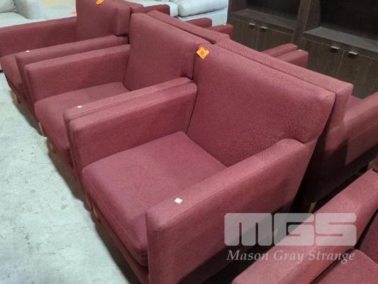 4 X UPHOLSTERED ARMCHAIRS - TEXTURED COARSE FABRIC, MIXED BRICK RED WEAVE, STITCHED TRACK ARMS.