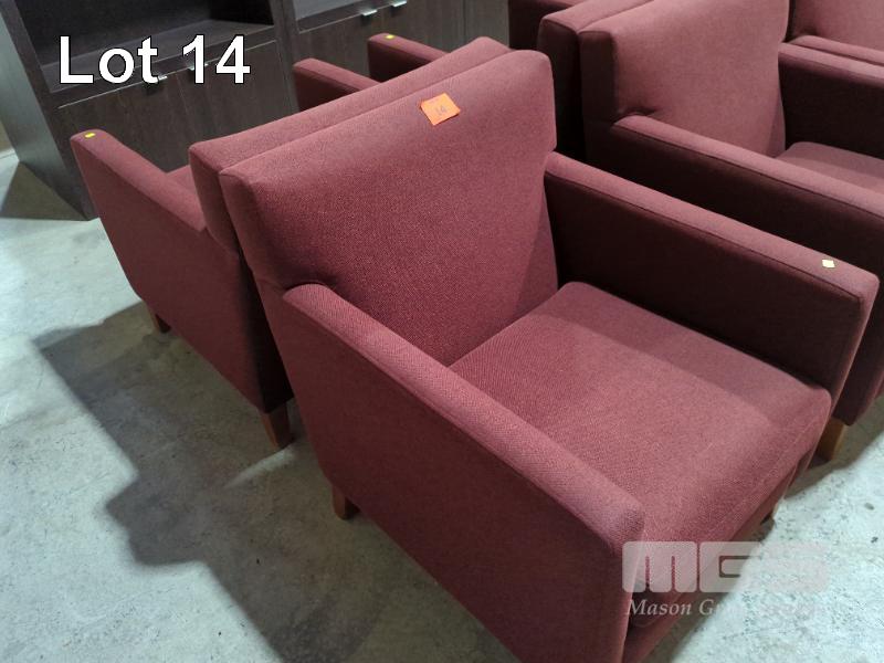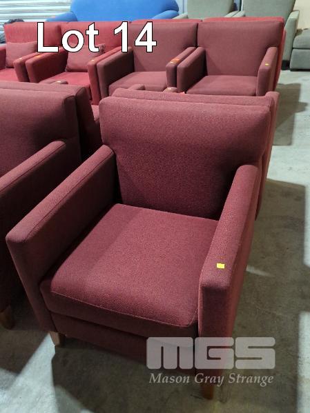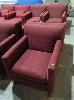 2 X UPHOLSTERED ARMCHAIRS - TEXTURED COARSE FABRIC, MIXED BRICK RED WEAVE, STITCHED TRACK ARMS.