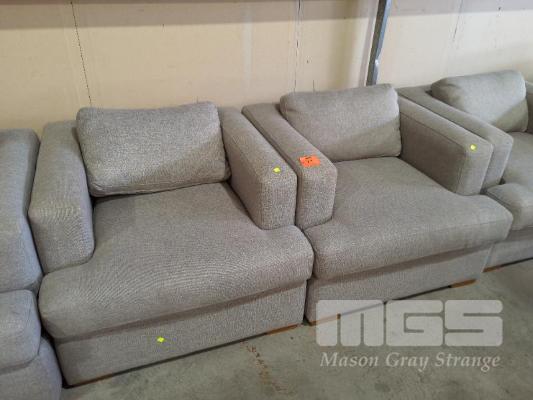 2 X UPHOLSTERED SINGLE SEAT LOUNGE CHAIRS. SQUARE ARMS, TEXTURED PLAIN WEAVE FABRIC IN GAINSBORO.