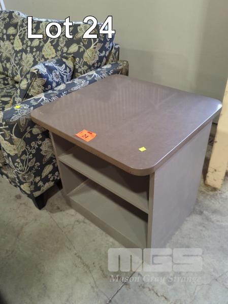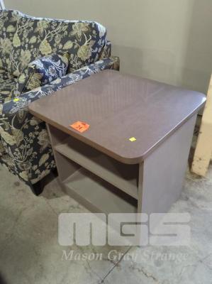 TWO SHELF LAMINATED STONE TOP BEDSIDE TABLE - ON CASTORS. COLOUR "MOCHA". TOP 65 X 60 CM (W D).