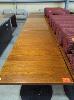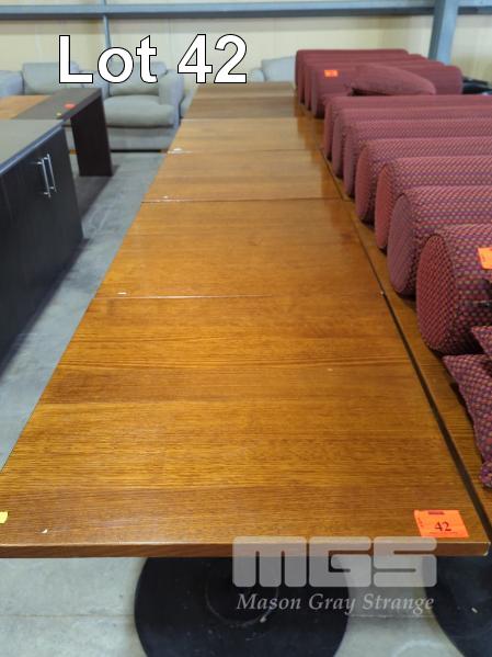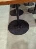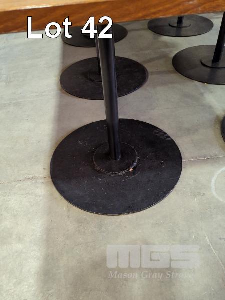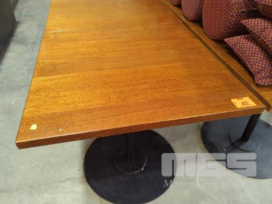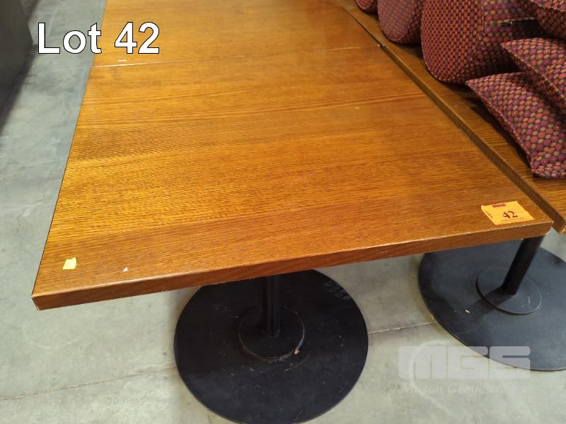 6 X FOUR-SEAT CAFE TABLES - HEAVY STEEL BASE IN BLACK, SOLID FINE GRAIN HARDWOOD TIMBER TOPS WITH INTERLOCK LUGS. 80 X 80 CM.