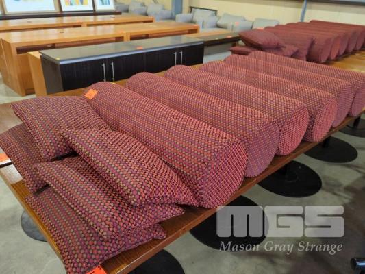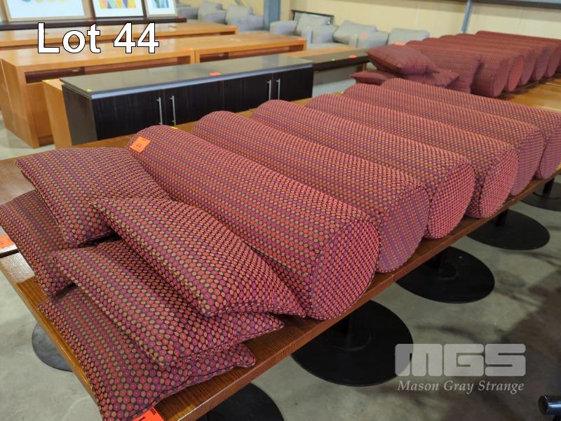6 X PATTERNED FABRIC BOLSTERS. 95 X 28 CM (W DIA.) AND 6 X MATCHING THROW CUSHIONS.