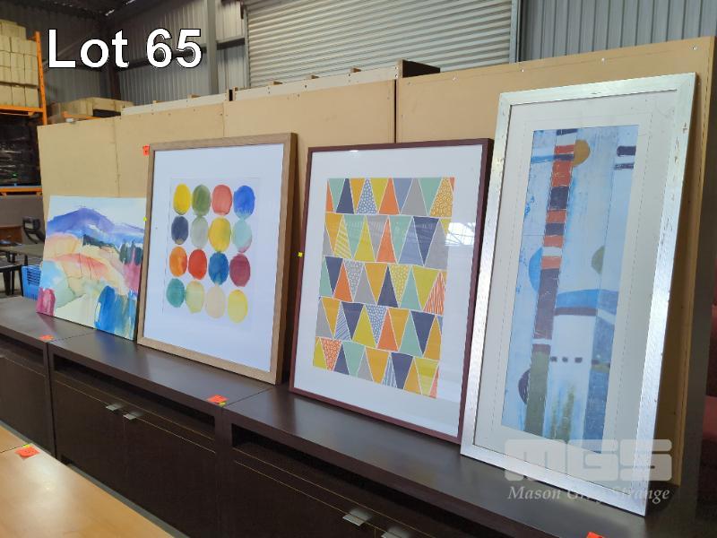 4 X PIECES OF WALL ART - ABSTRACT COLOURED PRINTS. 1 @ FRAMED 160 X 55 CM (W D). 1 @ FRAMED & GLAZED 81 X 101 CM (W D). 1 @ FRAMED & GLAZED 107 X 107 CM (W D). 1 @ CANVAS 108 X 78 CM (W D).