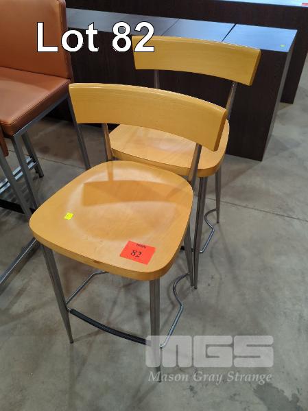 2 X COUNTER STOOLS - TIMBER SEAT, BENTWOOD BACK, CHROME FRAME & LEGS.