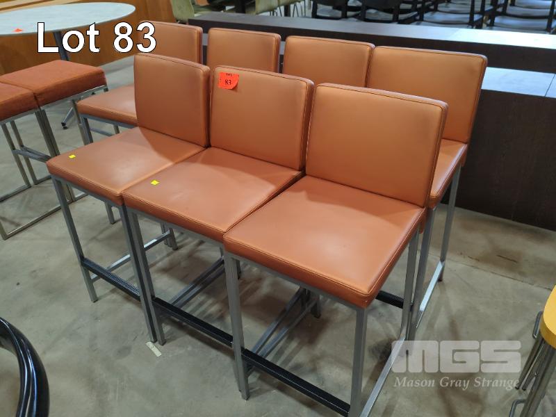 7 X COUNTER STOOLS - SATIN LOOK, STITCHED PADDED SEATS & BACKS, CHROME FRAME & LEGS.