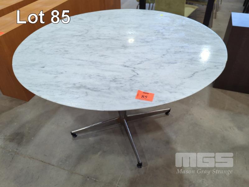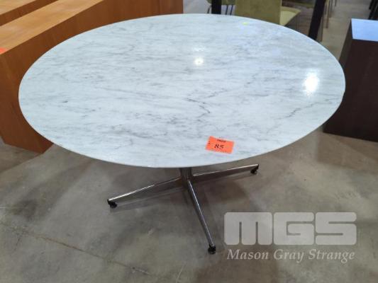 LARGE WHITE MARBLE LOOK STONE TOP, CIRCULAR TABLE - CHROME PEDESTAL. 120 CM DIA. * NUMEROUS CHIPS ON EDGE *