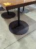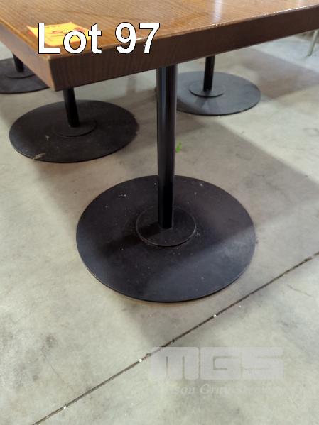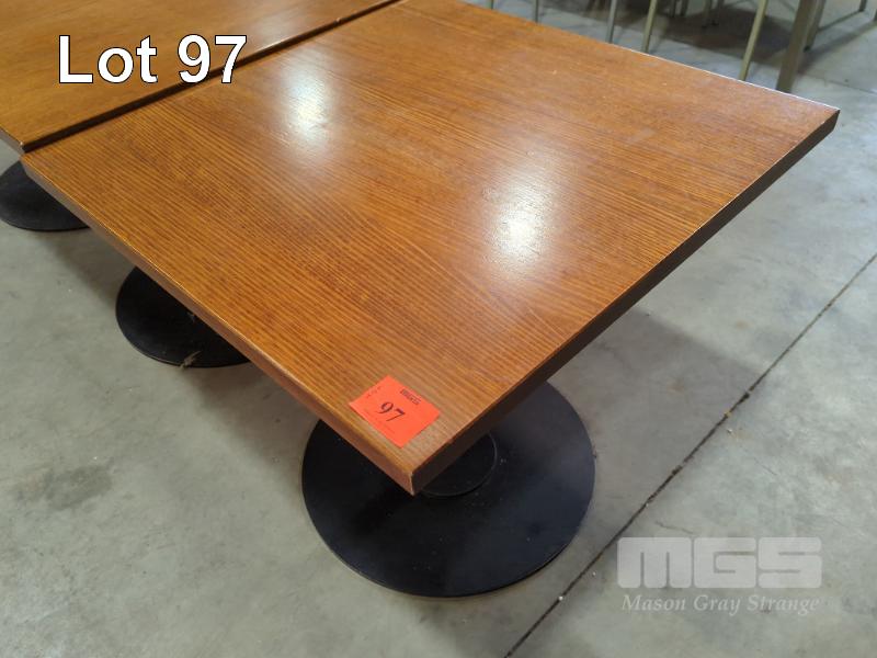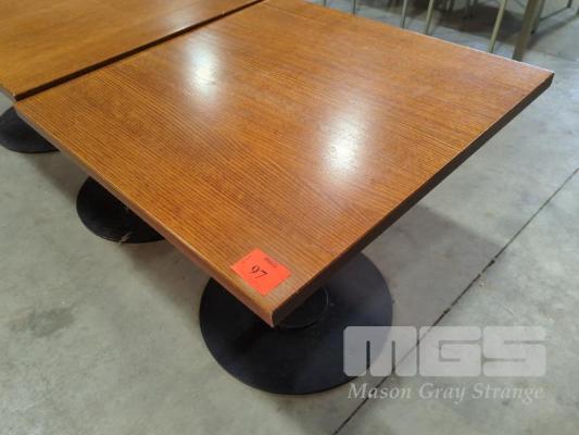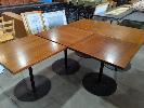 5 X FOUR-SEAT CAFE TABLES - HEAVY STEEL BASE IN BLACK, SOLID FINE GRAIN HARDWOOD TIMBER TOPS WITH INTERLOCK LUGS. 80 X 80 CM.