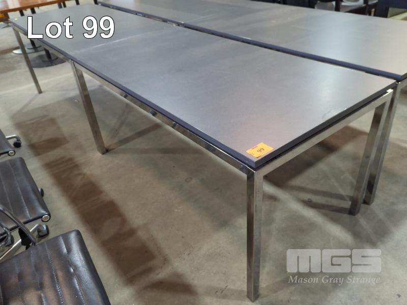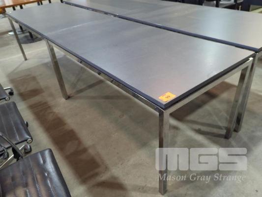 2 X EXECUTIVE CONFERENCE TABLES - SQUARE TUBE CHROME FRAME & LEGS, FLOATING LAMINATED TOPS IN TEXTURED GREY. 160 X 80 X 74 CM (W D H). * SOME IMPERFECTIONS *