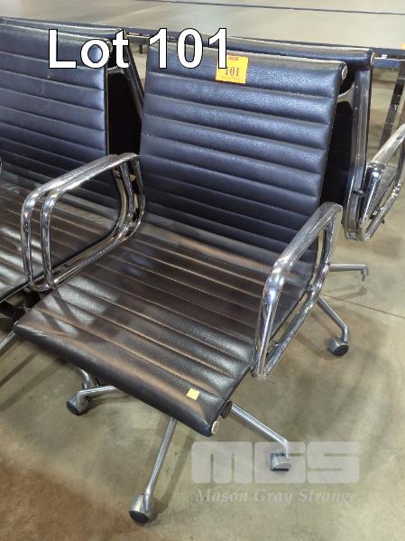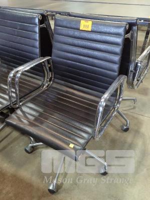 4 X EXECUTIVE CHAIRS - LOW BACK, BLACK STITCHED LEATHER LOOK SEAT & BACKREST, CHROME ARMRESTS, GAS LIFT, STEEL SWIVEL BASE ON CASTORS.
