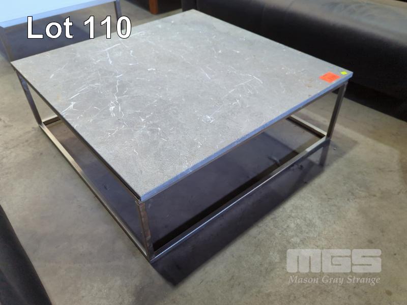 STONE COFFEE TABLE - GREY MARLE TOP WITH INCLUSIONS, STAINLESS STEEL LOOK SQUARE TUBE BASE.