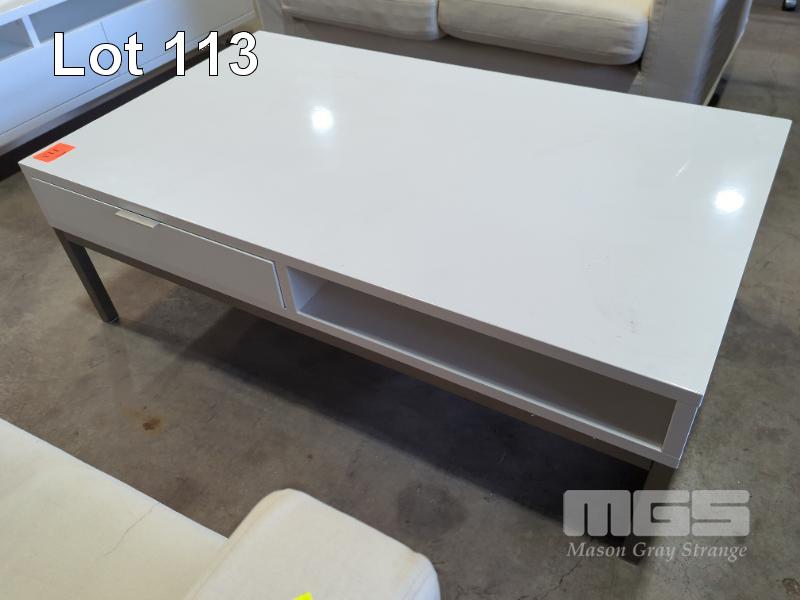 GLOSS WHITE COFFEE TABLE - TWO-DRAWER, MAGAZINE SHELF, BRUSHED NICKEL WATERFALL DRAW HANDLES, BRUSHED STEEL SQUARE TUBE FRAME & LEGS.