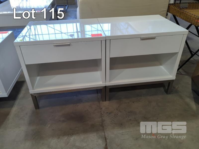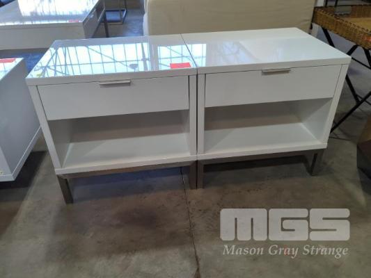 2 X GLOSS WHITE SIDE TABLES - SINGLE DRAWER, SINGLE SHELF, BRUSHED NICKEL WATERFALL DRAW HANDLES, BRUSHED STEEL SQUARE TUBE FRAME & LEGS.