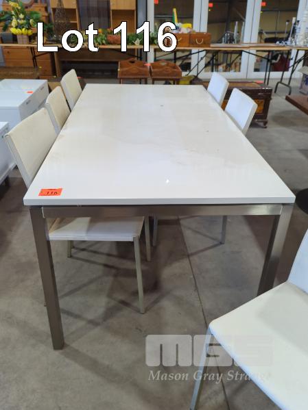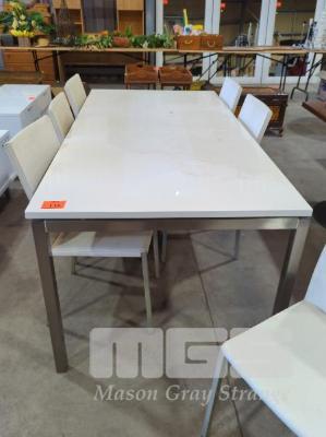 GLOSS WHITE EIGHT-SEAT DINING TABLE - FLOATING TABLE TOP, BRUSHED STEEL SQUARE TUBE FRAME & LEGS.