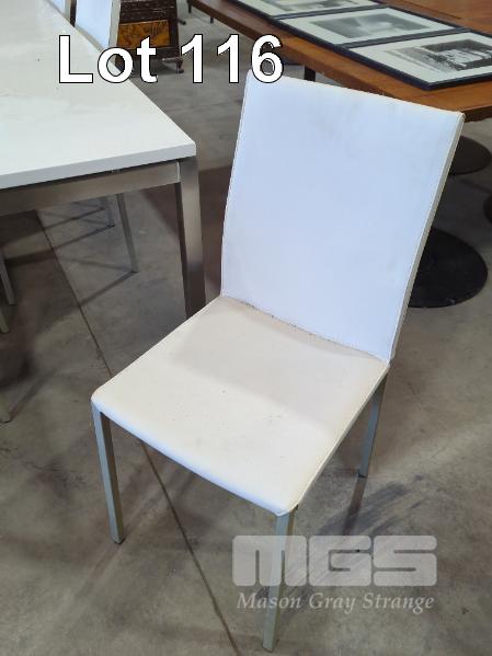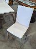 6 X WHITE DINING CHAIRS - STITCHED FAUX LEATHER PADDED SEATS & BACKRESTS, GRIT COATED STEEL LEGS.