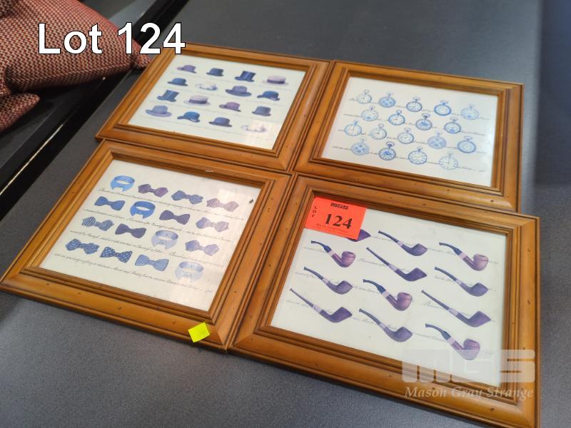 4 X PIECES OF WALL ART - PRINTS, FRAMED & GLAZED, 19TH CENTURY GENTLEMAN'S ACCOUTREMENTS. 31 X 27 CM.