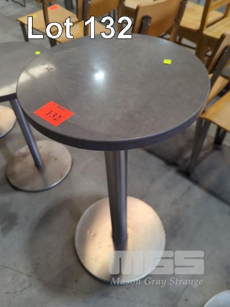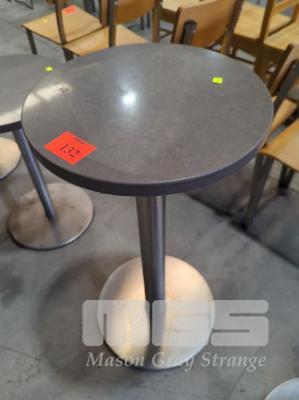 CIRCULAR, STONE DRY BAR - STONE TOP IN DARK BROWN-GREY WITH INCLUSIONS, HEAVY STEEL BASE AND PEDESTAL IN BRUSHED STEEL. 46 CM DIAMETER, 92 CM HEIGHT.