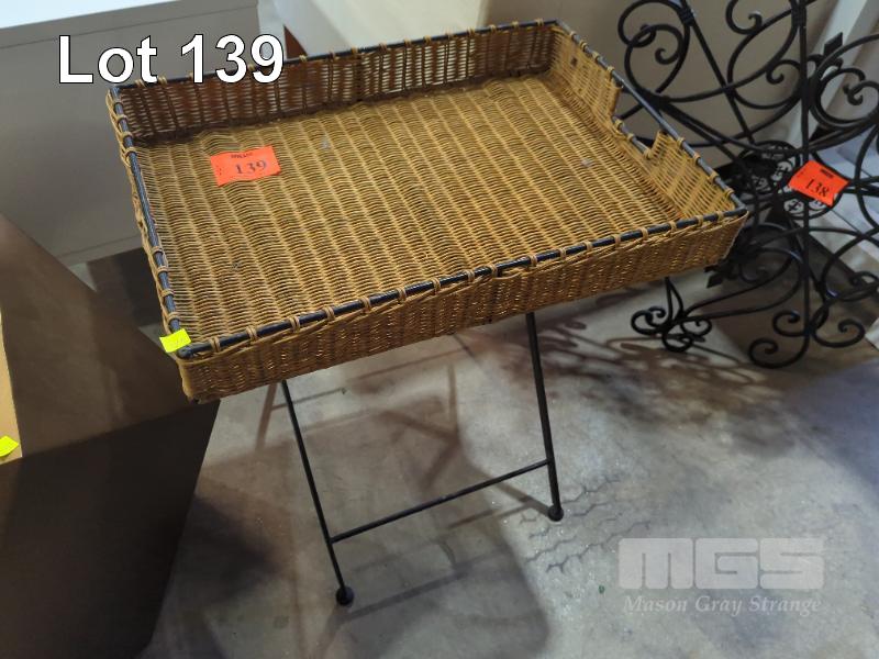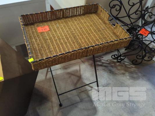 WICKER TRAY ON FAUX WROUGHT IRON FRAME & FOLDING STAND.
