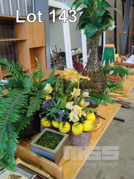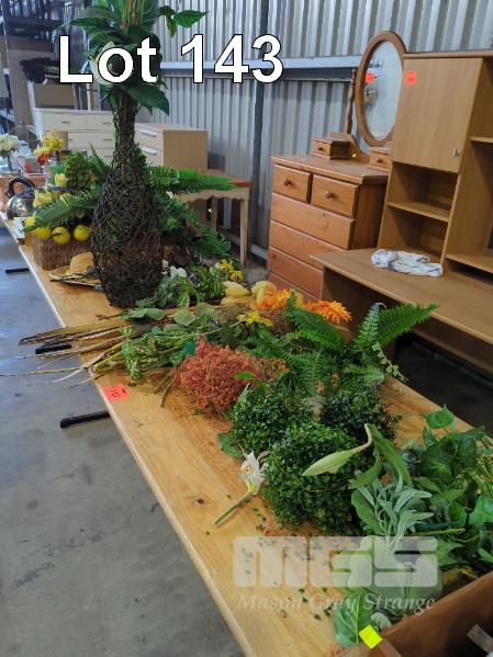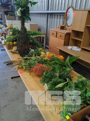 QUANTITY OF ARTIFICIAL PLANTS FLOWERS & STEMS, WICKER BASKETS, HAT ETC (1 X TABLE).