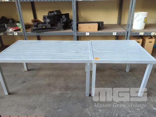 2 X OUTDOOR TABLES - COATED ALUMINIUM, MESH TOP, LIGHT GREY COLOUR. 1 @ 150 X 91 X 70 CM (W D H) 1 @ 91 X 91 X 70 CM (W D H)