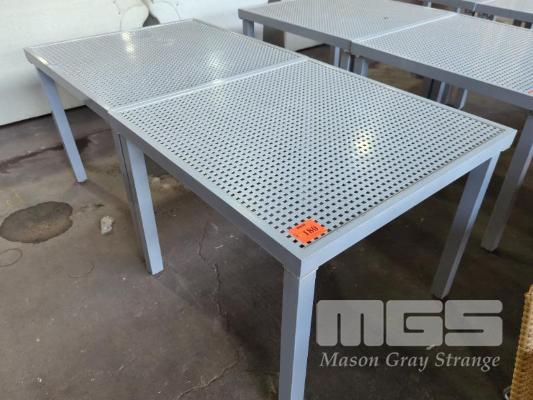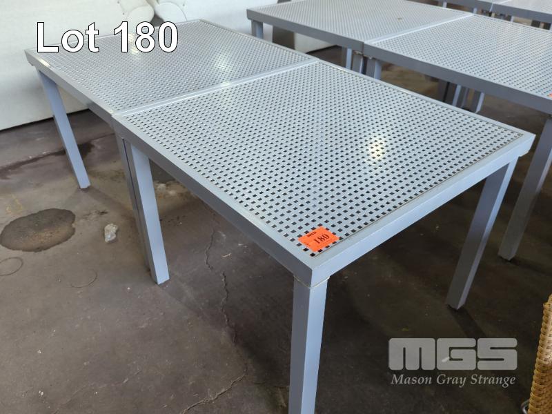 2 X OUTDOOR TABLES - COATED ALUMINIUM, MESH TOP, LIGHT GREY COLOUR. 91 X 91 X 70 CM (W D H)