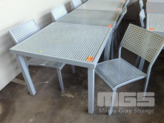 OUTDOOR TABLE - COATED ALUMINIUM, MESH CONSTRUCTION, LIGHT GREY COLOUR. 91 X 91 X 70 CM (W D H) 2 X MATCHING CHAIRS.
