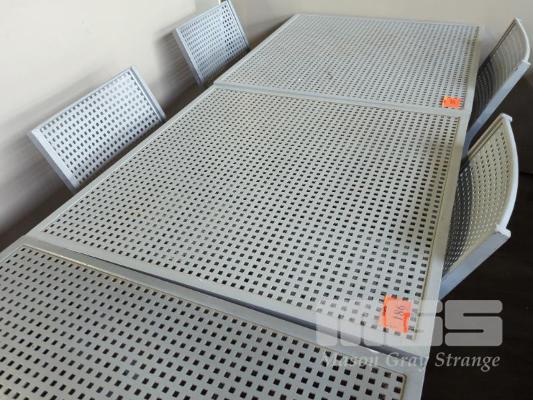 OUTDOOR TABLE - COATED ALUMINIUM, MESH CONSTRUCTION, LIGHT GREY COLOUR. 91 X 91 X 70 CM (W D H) 2 X MATCHING CHAIRS.