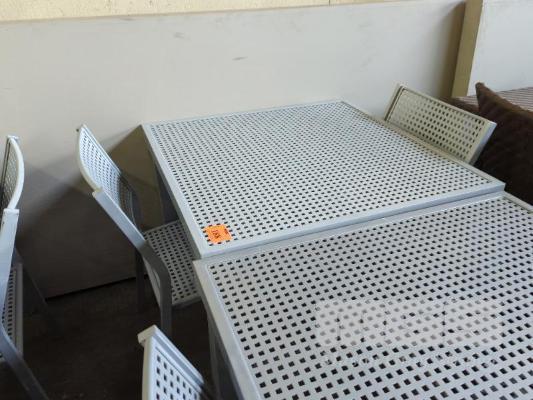 OUTDOOR TABLE - COATED ALUMINIUM, MESH CONSTRUCTION, LIGHT GREY COLOUR. 91 X 91 X 70 CM (W D H) 2 X MATCHING CHAIRS.