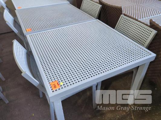 OUTDOOR TABLE - COATED ALUMINIUM, MESH CONSTRUCTION, LIGHT GREY COLOUR. 91 X 91 X 70 CM (W D H) 2 X MATCHING CHAIRS.