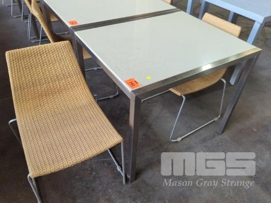 OUTDOOR TABLE - ACRYLIC FAUX STONE TOP, POLISHED STAINLESS LOOK SQUARE TUBE SIDES, FRAME & LEGS. 90 X 75 X 74 CM (W D H) 2 X RATTAN CHAIRS - PE RATTAN, WHEAT COLOUR, POLISHED STAINLESS LOOK FRAME & LEGS, STACKABLE.