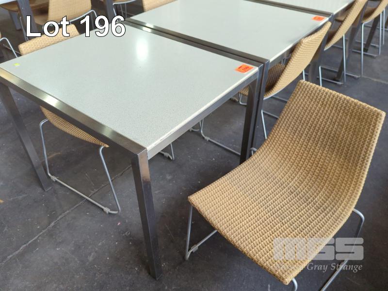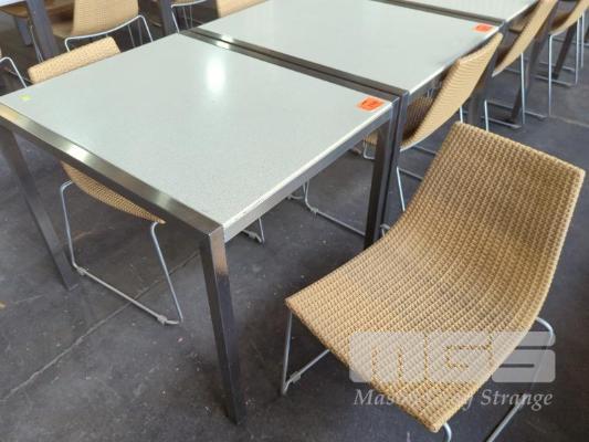 OUTDOOR TABLE - ACRYLIC FAUX STONE TOP, POLISHED STAINLESS LOOK SQUARE TUBE SIDES, FRAME & LEGS. 90 X 75 X 74 CM (W D H) 2 X RATTAN CHAIRS - PE RATTAN, WHEAT COLOUR, POLISHED STAINLESS LOOK FRAME & LEGS, STACKABLE.