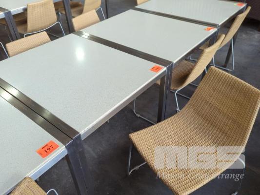 OUTDOOR TABLE - ACRYLIC FAUX STONE TOP, POLISHED STAINLESS LOOK SQUARE TUBE SIDES, FRAME & LEGS. 90 X 75 X 74 CM (W D H) 2 X RATTAN CHAIRS - PE RATTAN, WHEAT COLOUR, POLISHED STAINLESS LOOK FRAME & LEGS, STACKABLE.